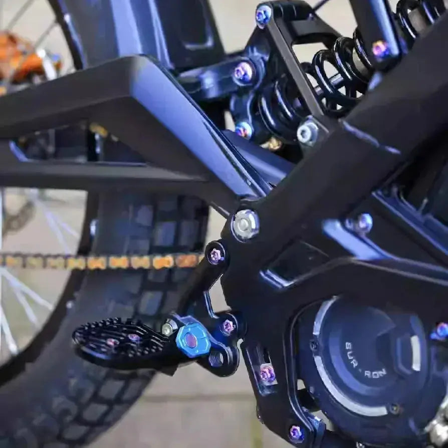 Precision Fitment: Designed to seamlessly integrate with SurRon foot peg mounts, ensuring a perfect fit with minimal adjustments. The exacting craftsmanship guarantees stable, secure installation, even in the most demanding terrains.