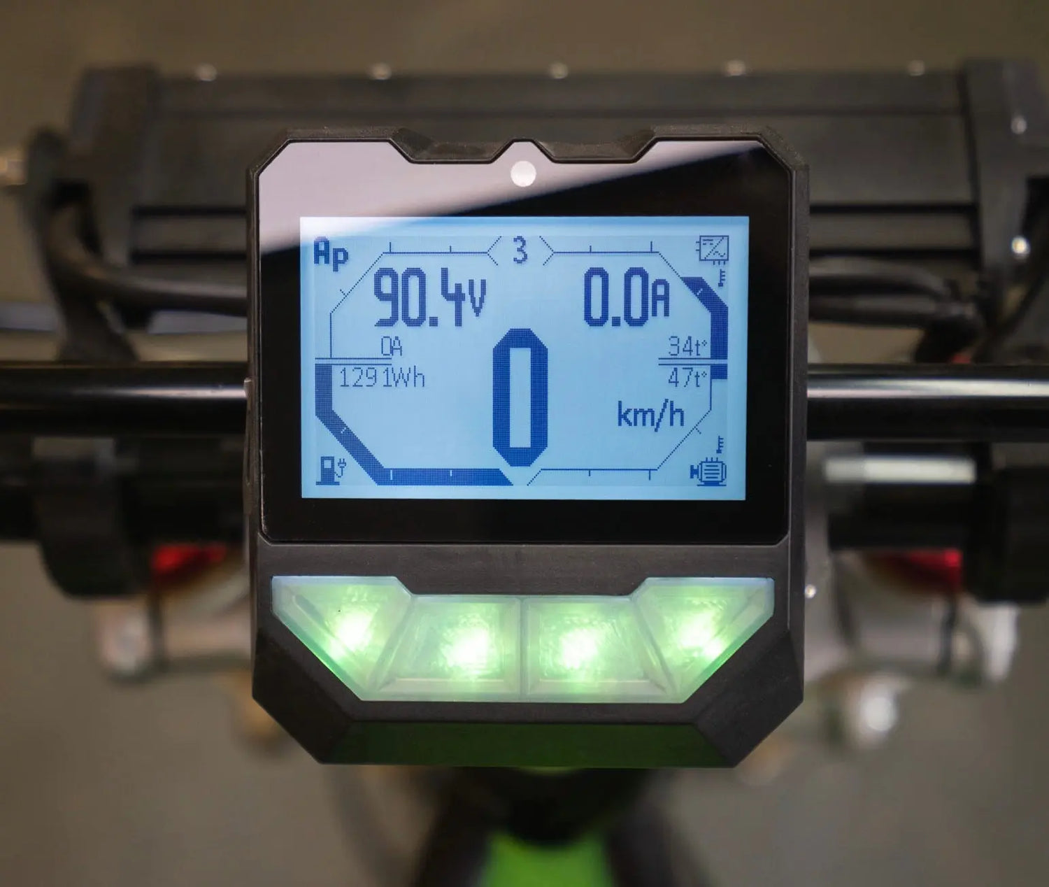 The Dash Panel Screen is equipped with the large sunlight resistant screen to display main parameters, driving modes settings, software updates for all system components, battery control, and the charging state of the devices via USB. Display only fits SinTech and Nucular 6F, 12F & 24F controllers