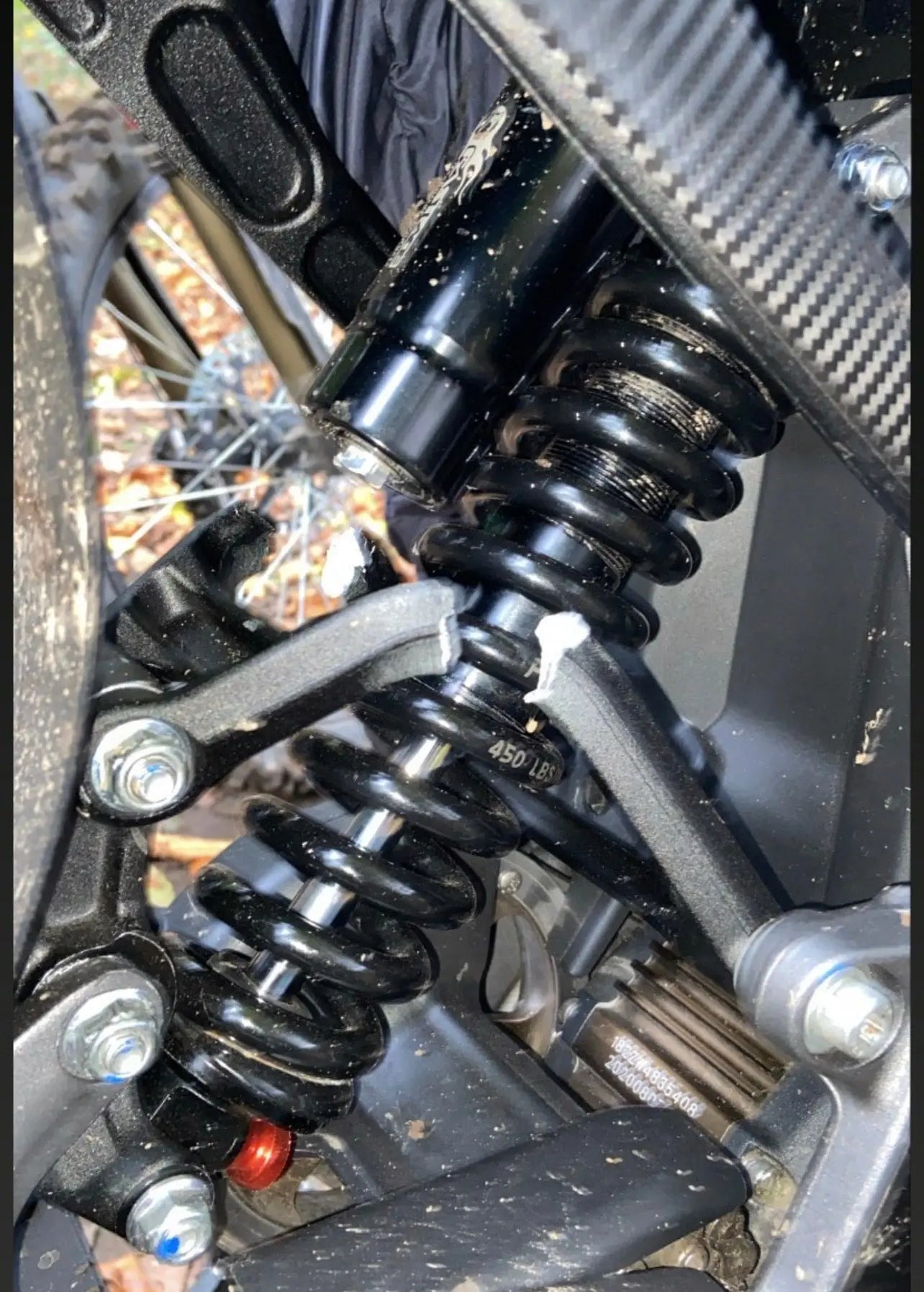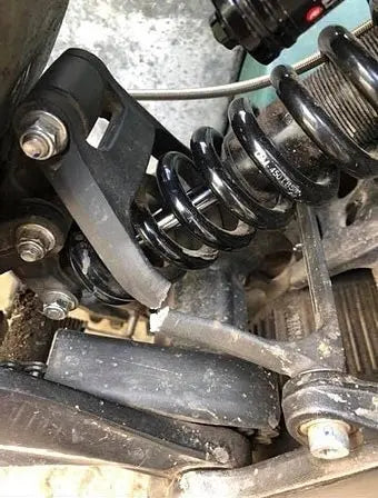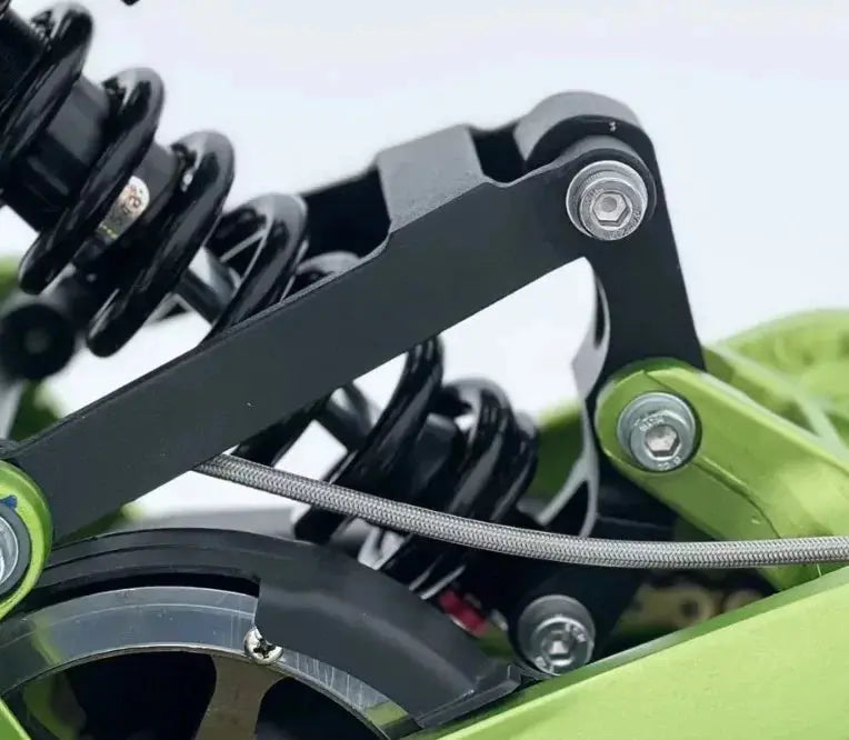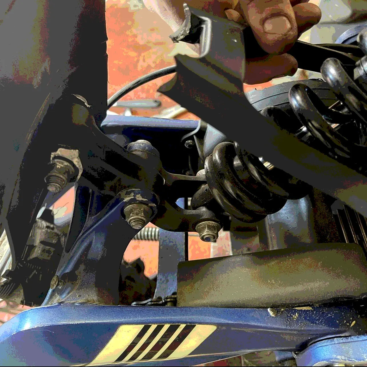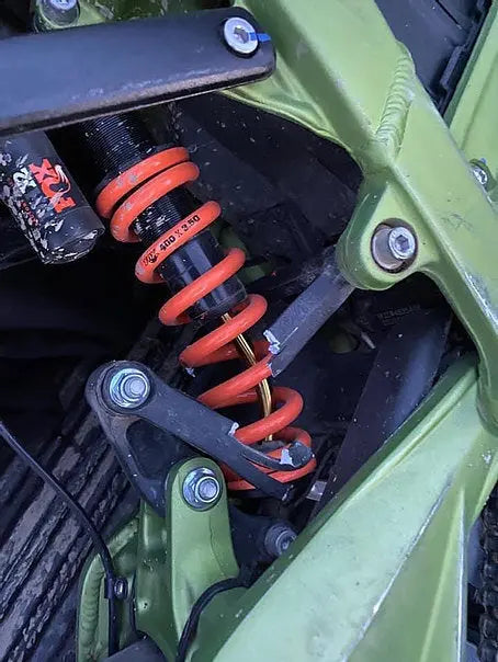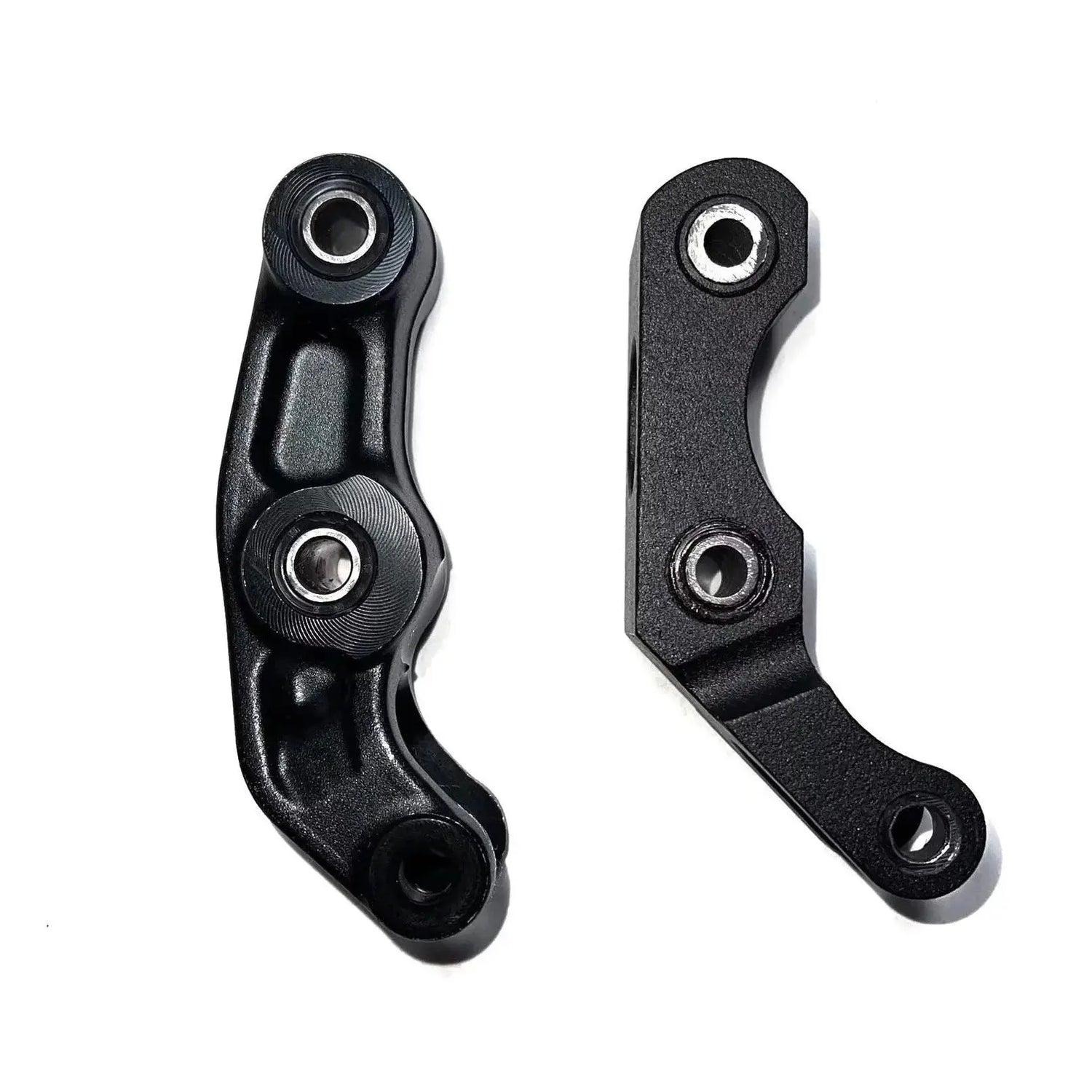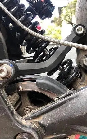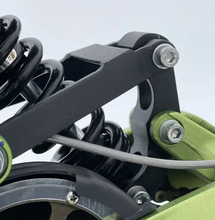 La liaison/triangle de progression Sur-Ron est un élément qui exerce une forte pression lors des réceptions et de la conduite tout-terrain en général. Les pièces d'usine sont fabriquées à partir de matériaux relativement bon marché qui se fissurent ou se brisent assez souvent en deux. SurRonshop propose une liaison et un triangle en acier renforcé ainsi qu'une version de liaison de levage de vélo de 30 mm (un angle plus prononcé de la partie de liaison inférieure donne un effet de levage). Le relevage arrière est livré avec des bagues en caprolactone et des bagues en acier à l'intérieur au lieu de roulements. Cette construction de moyeu rend la liaison plus fiable par rapport à la liaison à roulements (n'appliquez aucun lubrifiant !).