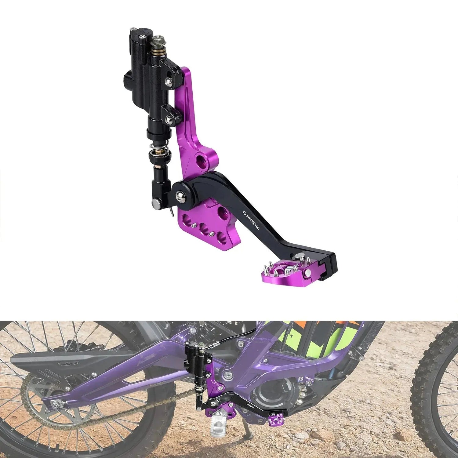 High-performance hydraulic rear foot brake assembly for Sur-Ron Light Bee and Segway X-series electric bikes. Features a CNC one-piece bracket with integrated spring, dual-direction folding brake pedal, and adjustable pedal position. Made from aircraft-grade 6061-T6 aluminum with an anodized, corrosion-resistant finish for long-term reliability.